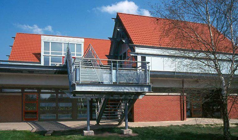 Der Zweigruppenkindergarten aus dem Jahre 1975 wurde um zwei weitere Einheiten mit angeschlossenen Kleingruppenräumen, eine große Spielfläche und Nebenräume für das Personal durch Aufstockung des eingeschossigen Flachdachgebäudes mit Hilfe einer Stahlkonstruktion erweitert. Hierdurch konnte Freifläche erhalten und das Gebäude mit geneigten Dachflächen ausgestattet werden. Die notwendige Fluchttreppe aus dem Dachgeschoss dient gleichzeitig als separater Zugang zum Freibereich.