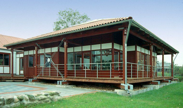 Die leicht hängige Geländeform und der schlechte Baugrund legten eine Holzbauweise für die Erweiterung nahe, da hiermit über wenige Punktfundamente die vergleichsweise geringen Lasten wirtschaftlich abgetragen werden konnten. Durch die rotbraune Farbgebung der Holzoberflächen wird die Einfügung in die durch Ziegelbauten geprägte Umgebung erreicht. Trotz der Erweiterung nach Norden fällt über die gläserne Firstpyramide Sonnenlicht in den Gruppenraum.