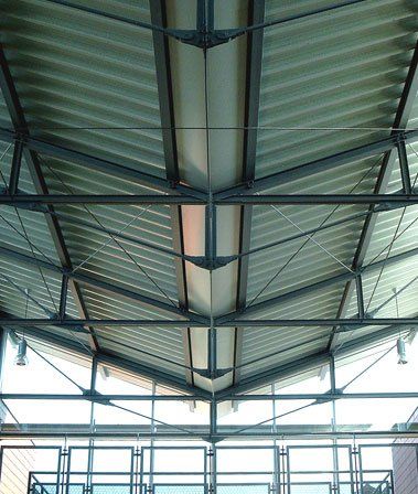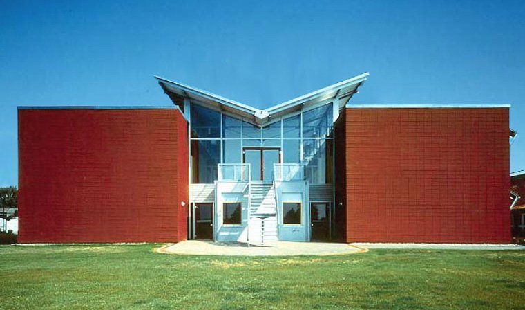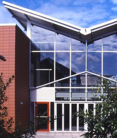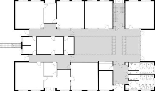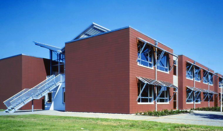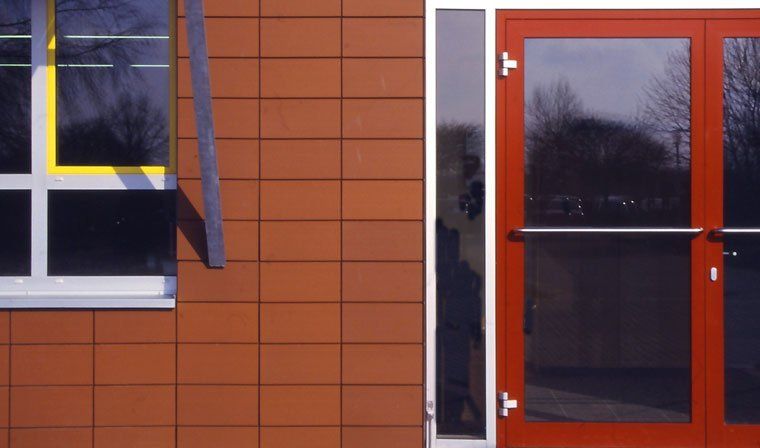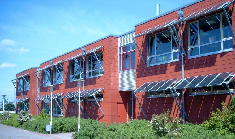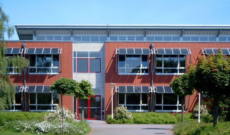 Das kompakte Gebäude mit 12 Klassen-, 3 Gruppen-, 2 Werkräumen und Nebenräumen auf 2 Ebenen fungiert als Ersatz für 6 eingeschossige Pavillons. Die erweiterte Verkehrsfläche im EG kann als Pausenhalle und Aula genutzt und über eine Glasfaltwand direkt zum Pausenhof geöffnet werden. Die Konstruktion besteht aus zweigeschossigen Stahlrahmen, Stahlbetonfertigteildecken und vorgefertigter, hoch wärmegedämmter Holzrahmenfassade mit äußerer Tonziegelverkleidung. Das Schmetterlingsdach prägt den Charakter der Schule. CTS-Solarmodule an der Südfassade dienen zugleich als feststehender Sonnenschutz. Ein Display im Windfang zeigt die Werte für solare Stromproduktion, Strom-, Regen- und Trinkwasserverbrauch, sowie den Verbrauch der Heizungsanlage.