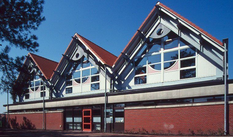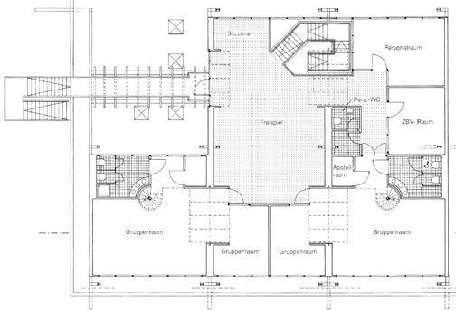 Der Zweigruppenkindergarten aus dem Jahre 1975 wurde um zwei weitere Einheiten mit angeschlossenen Kleingruppenräumen, eine große Spielfläche und Nebenräume für das Personal durch Aufstockung des eingeschossigen Flachdachgebäudes mit Hilfe einer Stahlkonstruktion erweitert. Hierdurch konnte Freifläche erhalten und das Gebäude mit geneigten Dachflächen ausgestattet werden. Die notwendige Fluchttreppe aus dem Dachgeschoss dient gleichzeitig als separater Zugang zum Freibereich.
