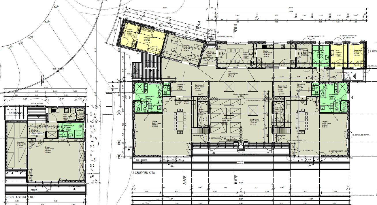 Neubau einer Kindertagesstätte mit zwei Gruppenräumen und einer Großtagespflege mit einem Gruppenraum in zwei Gebäudekörpern.