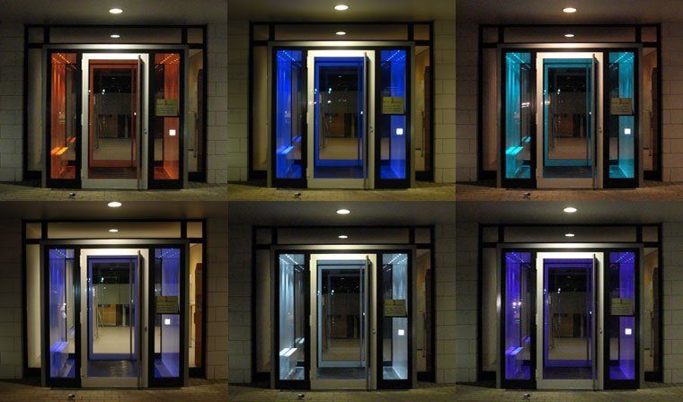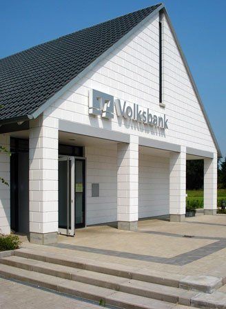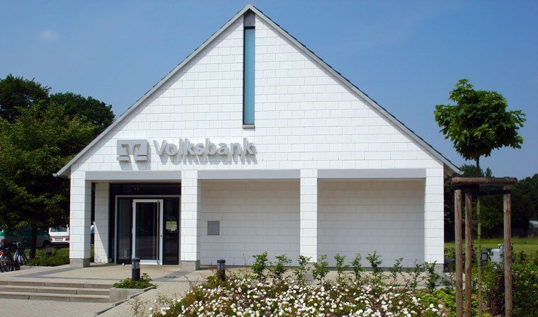Die Geschäftsstelle steht an einer viel befahrenen Kreuzung der B 71. Sie schließt eine bislang offene Ecke im städtebaulichen Kontext, jedoch leider nur unzureichend, da die ursprüngliche Planung vom Bauherrn vor der Realisierung bezüglich Raumprogramm und Baumasse noch deutlich reduziert wurde. Die großformatigen weißen Kalksandsteine nehmen farblich Bezug zu weiß verputzten Gebäuden in der Nachbarschaft. Nachts erstrahlt der Windfang des Gebäudes in wechselnden Farben.