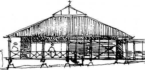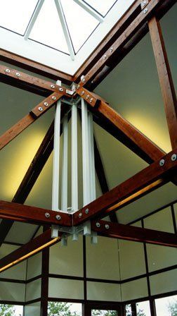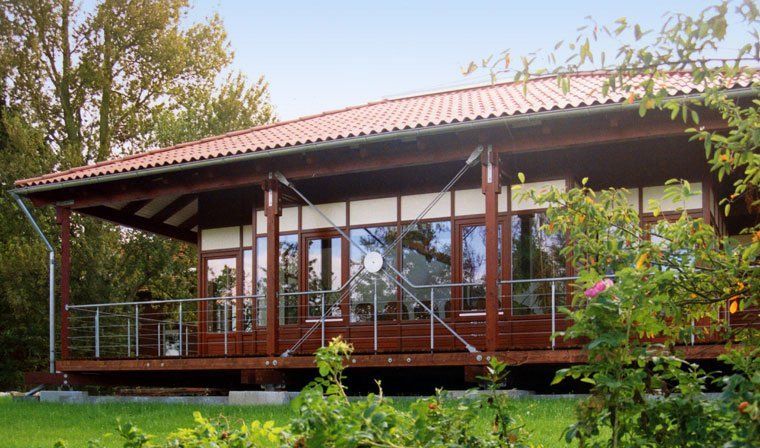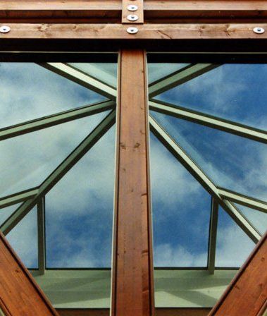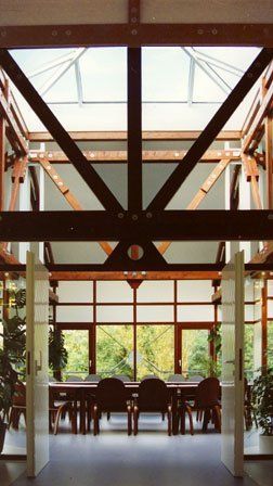 Die leicht hängige Geländeform und der schlechte Baugrund legten eine Holzbauweise für die Erweiterung nahe, da hiermit über wenige Punktfundamente die vergleichsweise geringen Lasten wirtschaftlich abgetragen werden konnten. Durch die rotbraune Farbgebung der Holzoberflächen wird die Einfügung in die durch Ziegelbauten geprägte Umgebung erreicht. Trotz der Erweiterung nach Norden fällt über die gläserne Firstpyramide Sonnenlicht in den Gruppenraum.