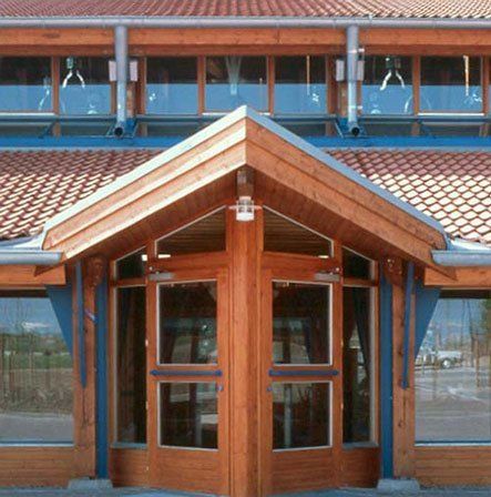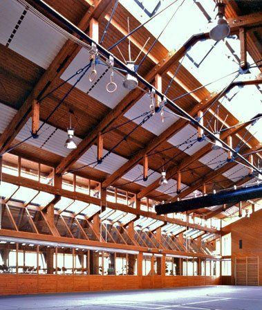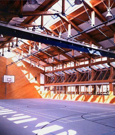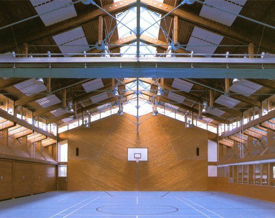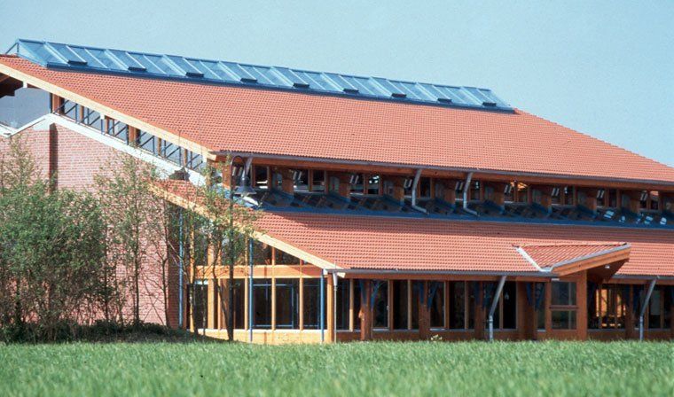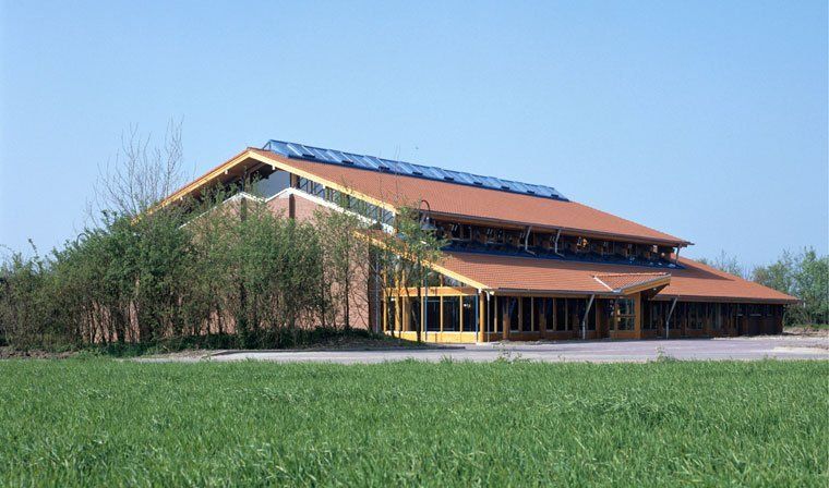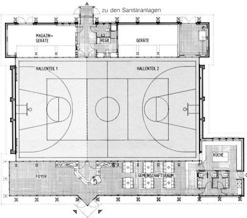An die 15x27m große Halle schließen sich beidseitig Magazin, Geräte-, Heizraum bzw. Foyer, Gemeinschaftsraum und Küche an. Durch verglaste Wände bestehen Blickverbindungen zwischen Foyer / Gemeinschaftsraum und Halle. Große Dachflächen stellen Bezüge zu regionaltypischen ländlichen Bauten her.