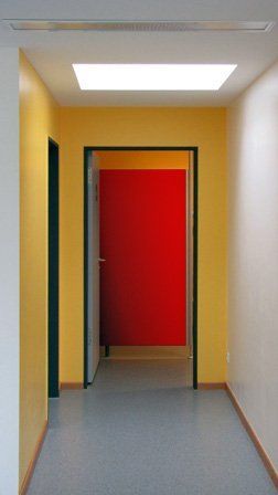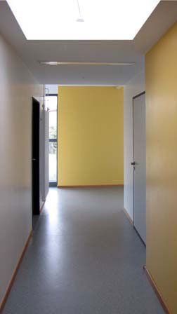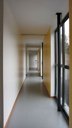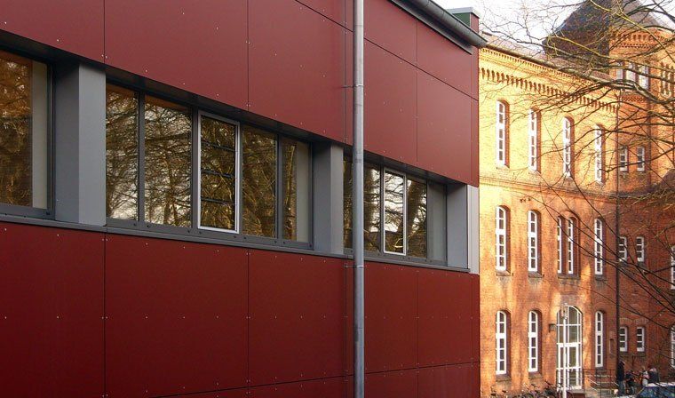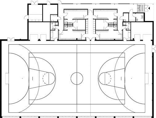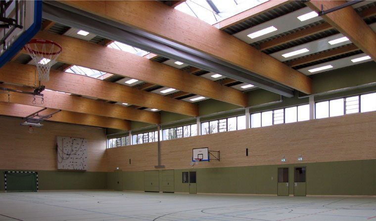 Die 21m x 45m große Zweifeldhalle ist als reine Spielhalle konzipiert, wodurch Flächen für die Geräteräume minimiert werden konnten. Als Fassadenverkleidung wurden die gleichen HPL-Platten wie beim parallel errichteten Mehrzweckgebäude eingesetzt..