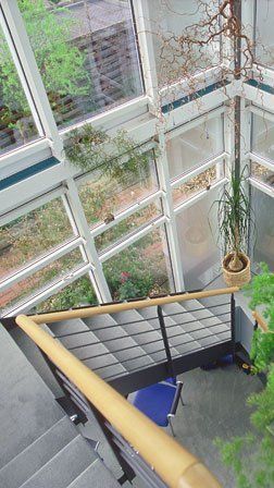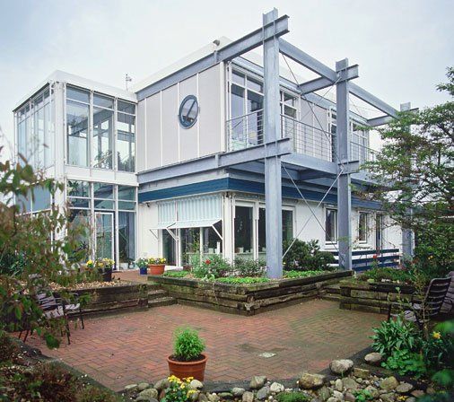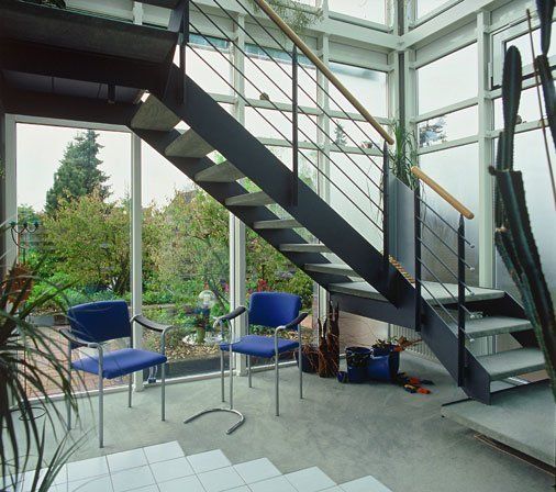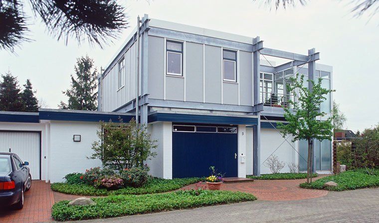 Die gewünschte Erweiterung des Flachdachgebäudes war nur in einer zweiten Ebene zu realisieren, wobei die vorhandene Dachdecke keine zusätzlichen Lasten aufnehmen konnte. Da das Haus während der gesamten Bauzeit bewohnbar bleiben musste, wurde das Erdgeschoss mit einer Stahlrahmenkonstruktion frei überspannt und ein verglaster Treppenaufgang seitlich angebaut. Hierdurch konnten die Eingriffe in den Bestand minimal gehalten werden. Durch den neuen Flachdachbaukörper blieb der Charakter der Gesamtanlage auch in Bezug auf das Umfeld erhalten. Da das Obergeschoss weniger als 2/3 der Fläche des Erdgeschosses aufweist, gilt diese Bebauung gemäß Niedersächsischer Bauordnung als eingeschossig.