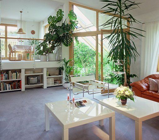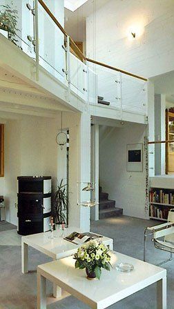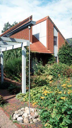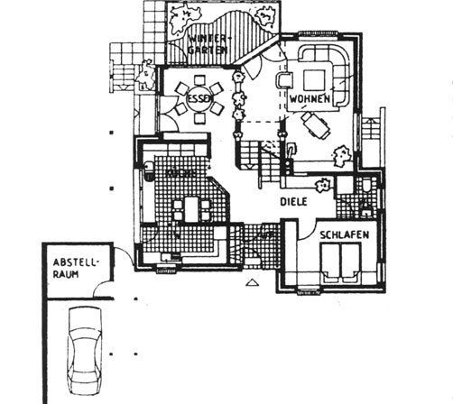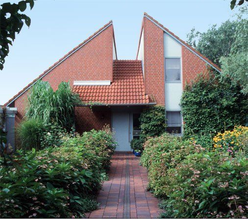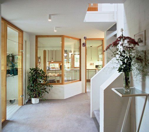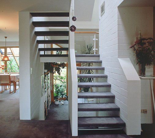 Die Baukörperform mit vier, sich teilweise verschneidenden Pultdächern ermöglicht niedrige Traufhöhen. zu den dichtstehenden Nachbarhäusern aber auch eine Anpassung der gartenseitigen Dachläche an den Hangverlauf des Grundstückes. Wegen des hängigen Geländes bot sich die Anordnung eines Geschossversatzes an. Fünf verschiedene Niveaus sind über die zentrale Treppe miteinander verbunden und bieten zahlreiche gegenseitige Blickbeziehungen.